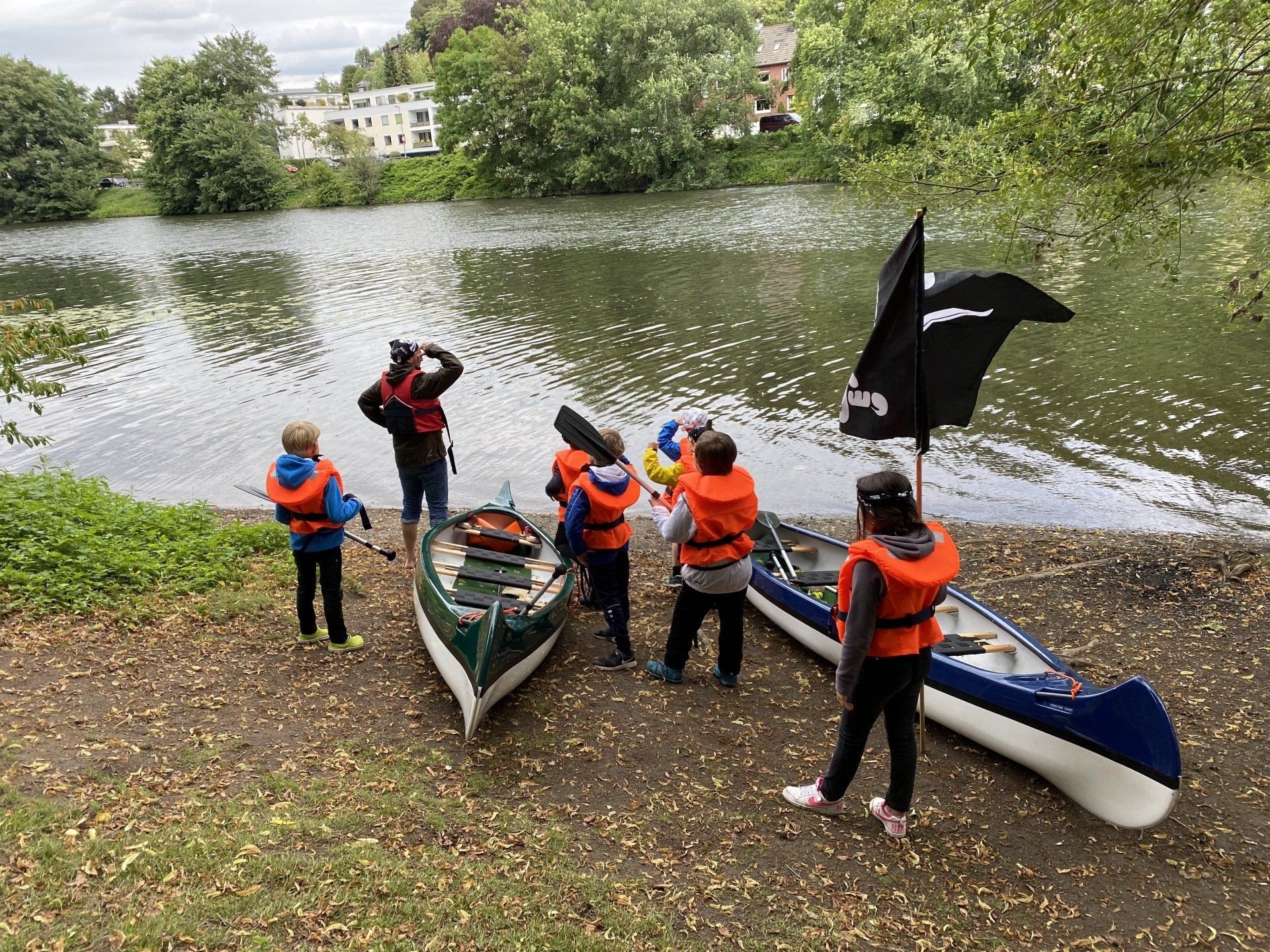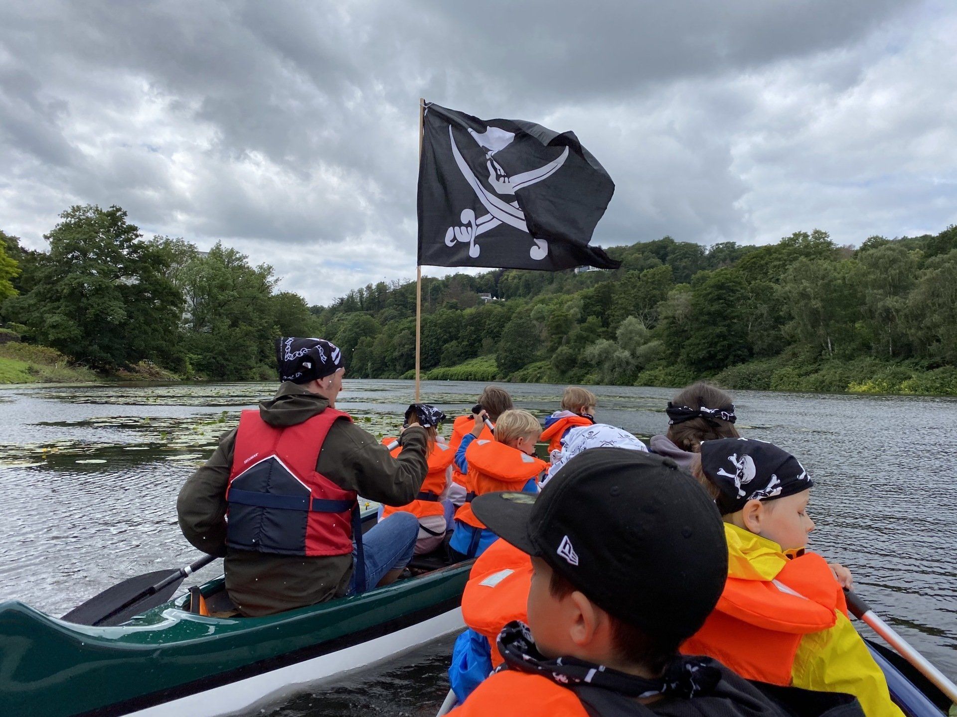 Als Piraten gehen wir mit eigenen Kanus auf große Entdeckungsfahrt.
